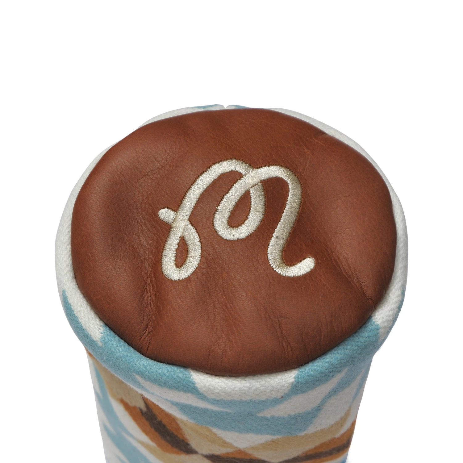 Rancho Arroyo – Aqua is a blanket-weight virgin wool woven by PendletonÂź Woolen Mills in the Pacific Northwest. This pattern features a tricolor base that includes ivory, aqua, and shades of brown. The tricolor of this pattern serves as the perfect backdrop for an exquisite teal geometric pattern. Topped of with a lid made from Aniline British Tan Leather.